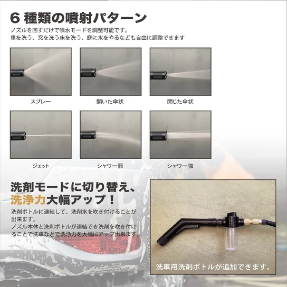 ノズル本体と洗剤ボトルが連結でき洗剤を吹き付けることで洗車などで洗浄力を大幅にアップ出来ます。